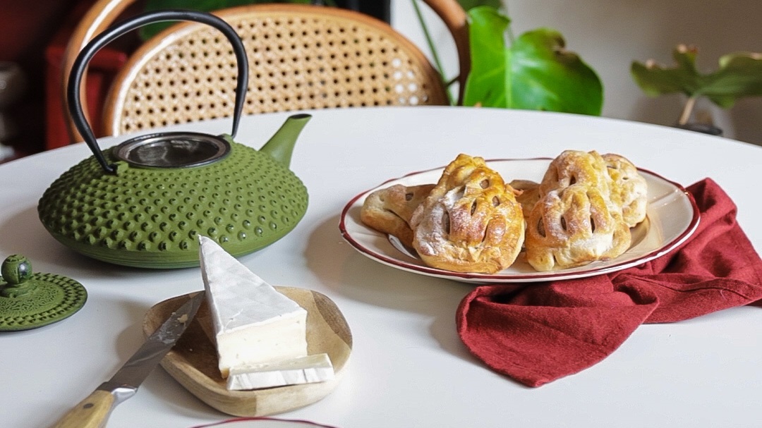 4. Mettez ensuite un morceau de brie et une poire entière sur cette pâte et repliez celle-ci tout autour de la poire pour former un joli petit paquet.