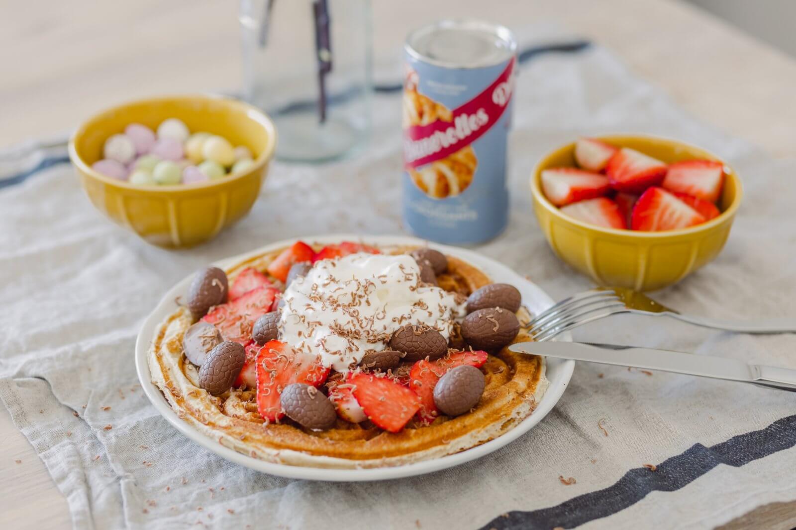 - Serveer de croissantwafels met de slagroom, aardbeien en kleine chocolade-eitjes.